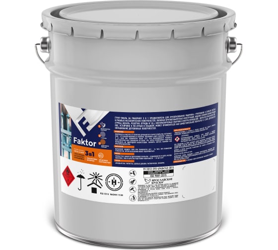 Грунт-эмаль на ржавчину FAKTOR 3 в 1 предназначена для преобразования ржавчины, грунтования и окраски чистых и ржавых металлических поверхностей, включая крупногабаритные конструкции, изделия сложной конфигурации (трубы, мебель, решетки, ограды и т.д.), эксплуатируемые снаружи и внутри помещений.